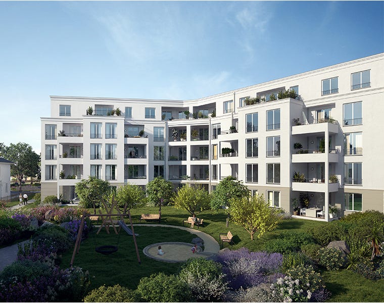 Nur ein Kilometer hinter der Stadtgrenze Berlins entstand mitten im Grünen ein modernes Quartier mit 48 Eigentumswohnungen mit zwei bis vier Zimmern. Schlauchboot, Winterreifen & Co bringen die Bewohner ganz einfach mit dem Aufzug in den eigenen Keller. So ist mehr Platz in den hellen Wohnungen. Das Quartier wurde 2018 fertiggestellt.