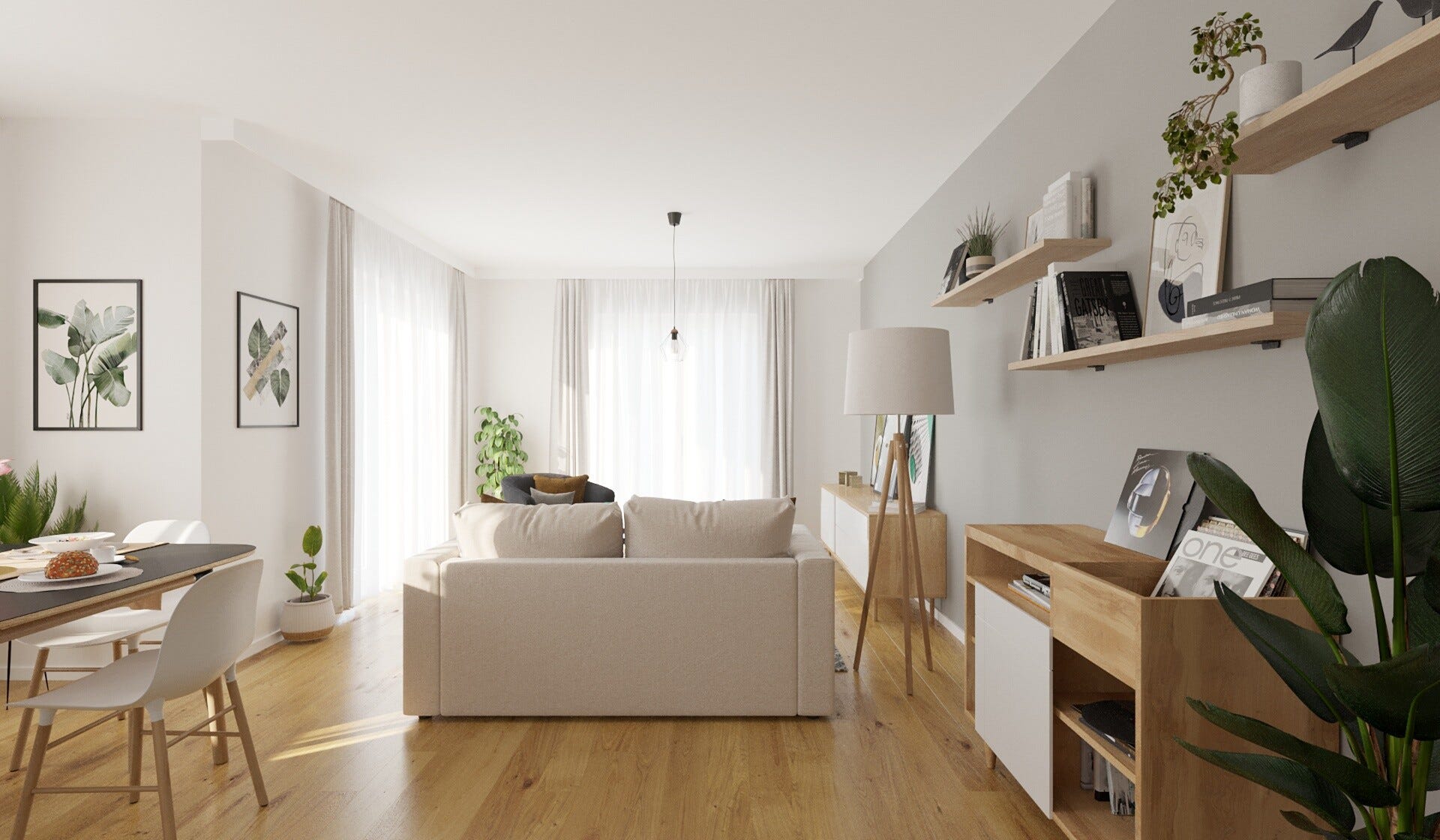 Ein offener Wohn- und Küchenbereich, ein Schlaf- sowie ein Kinderzimmer, Bad, Balkon und ein Abstellraum. Die 3-Zimmer-Wohnungen im Quartier am alten Schlosspark sind auch für Familien eine gute Wahl.