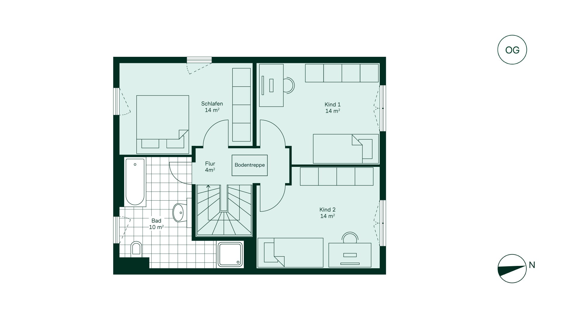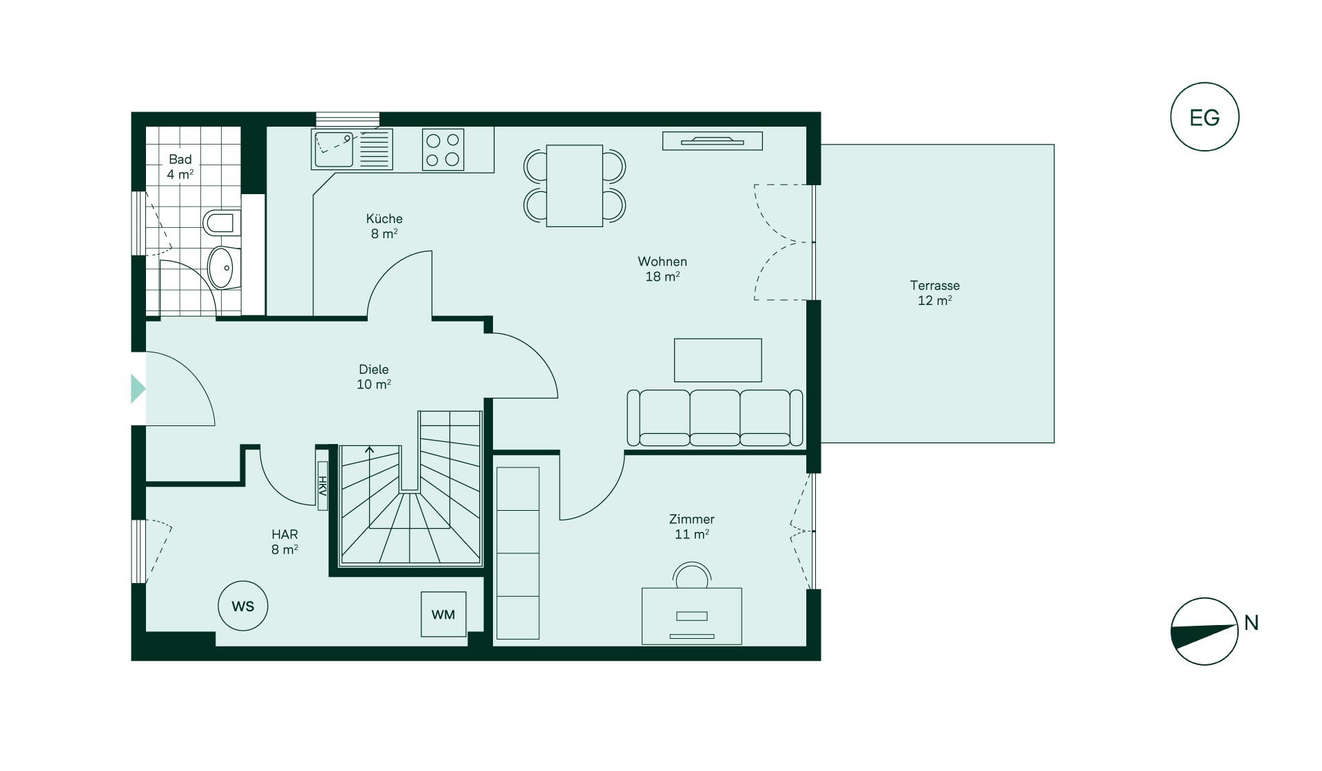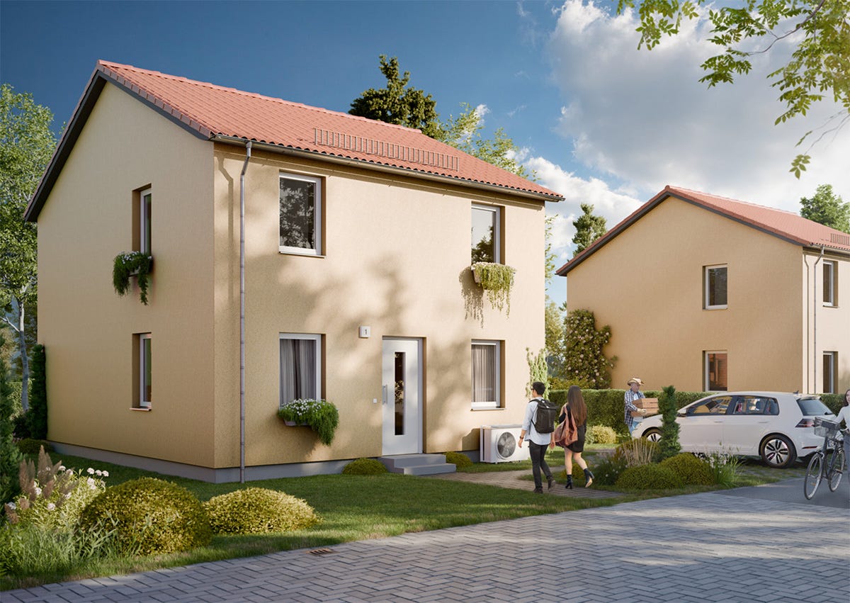 Willkommen im Haus Optima. Die Küche geht direkt in den Wohnbereich über. Von hier aus gelangen Sie auf die Terrasse und in Ihren Garten. Ein weiteres Zimmer, ein WC und ein Hauswirtschaftsraum ergänzen das Erdgeschoss. Oben befinden sich drei Schlafzimmer und das Familienbad.