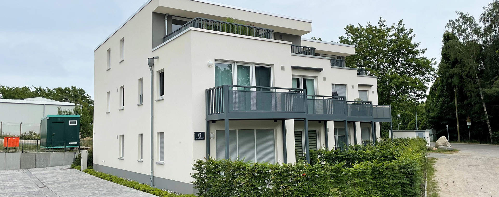 Sonntag, 19. April 2026Haus B zeigt sich nun mit vollständig gestalteter Fassade. Aktuell starten die Arbeiten an den Außenanlagen und die Fundamente für die Balkone werden vorbereitet. Damit entstehen nach und nach die Bereiche, die später zusätzlichen Freiraum und Aufenthaltsqualität bieten. Der Einzug ist für den Herbst in diesem Jahr vorgesehen.