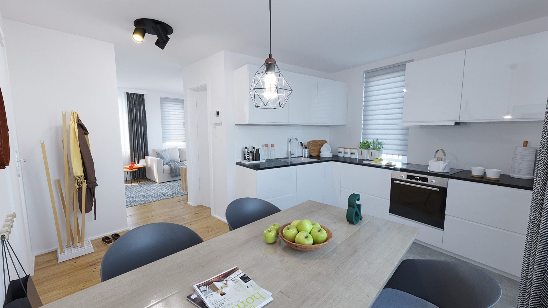 Familien finden in dieser Wohnung mit Dachterrasse, Fußbodenheizung, Parkettboden und zwei Abstellräumen genug Platz. Ein Bad mit bodengleicher Dusche und ein Gäste-WC ermöglichen morgendliche Entspannung. Außerdem bietet der begrünte Innenhof mit Spielplatz, Urban-Gardening-Bereich, Carsharing-Station und Packstation zusätzliche Annehmlichkeiten.