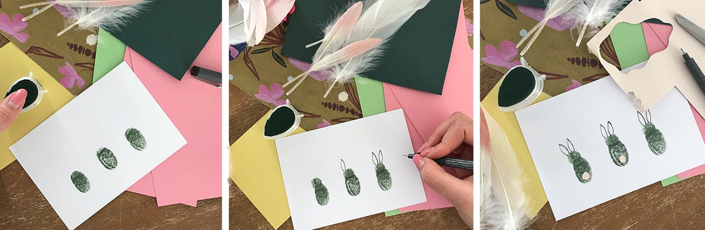 - Daraufhin drücken Sie Ihren Zeigefinger in die Farbe und pressen ihn oberhalb des ersten Daumenabdrucks auf die Karte. Das wird dann der Hasenkopf. So können Sie eine ganze Hasenfamilie erschaffen.