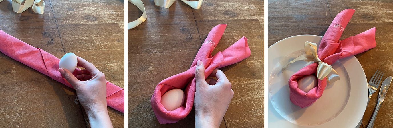 3. Knicken Sie die Rolle in der Mitte und binden Sie diese im unteren Drittel zusammen. Schauen Sie - bevor Sie die Schleife binden - ob das Ei hineinpasst.